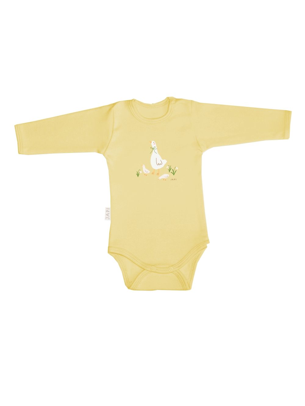 Ez a kényelmes, hosszú ujjú body puha pamutból készült, így kíméletes a babák érzékeny bőréhez. A vidám libaminta játékos karaktert ad a ruhadarabnak. Patentos záródás a könnyű öltöztetés és pelenkázás érdekében. Ideális hűvösebb napokra vagy alsó rétegként. Három természetes színben kapható.