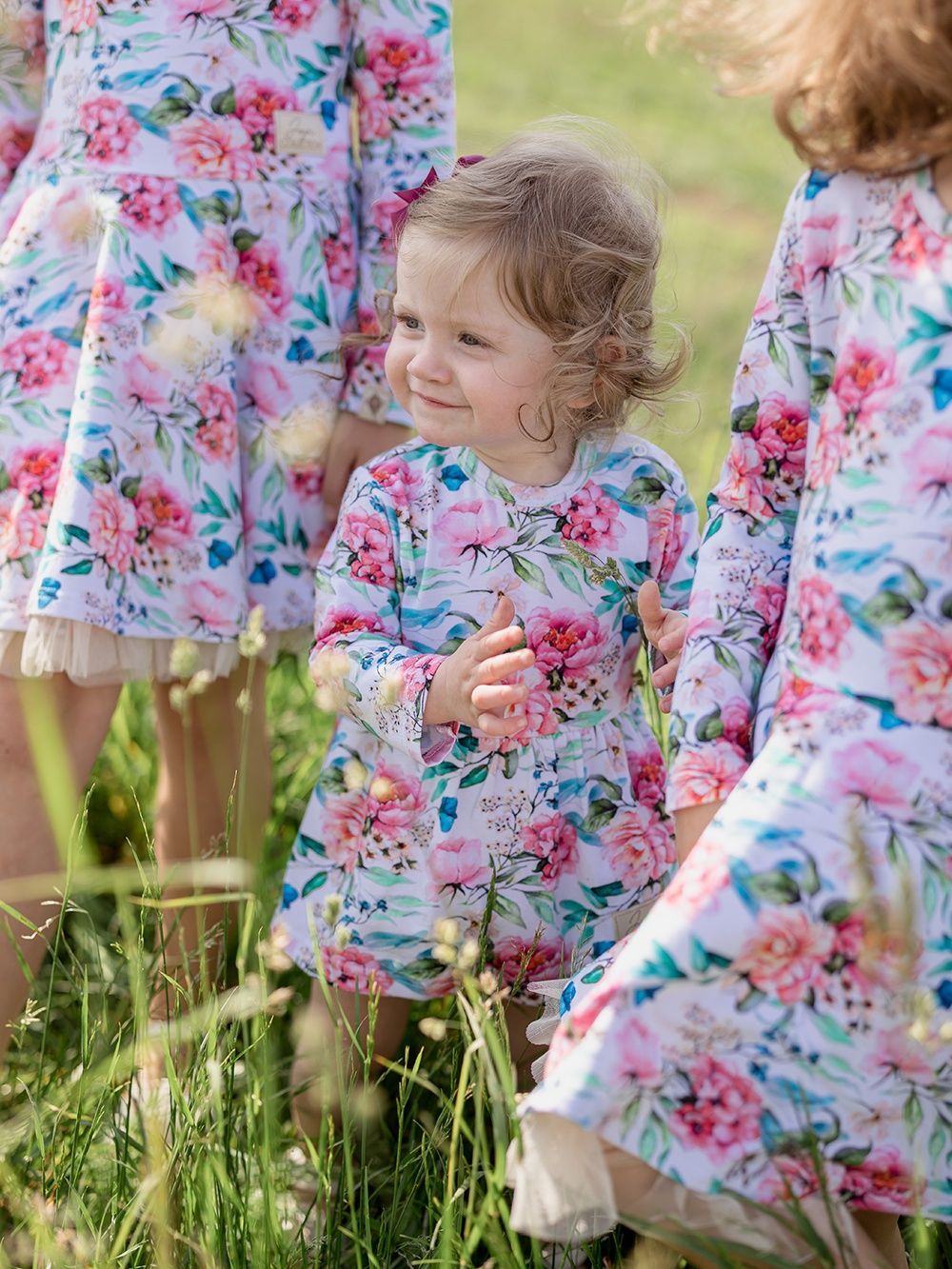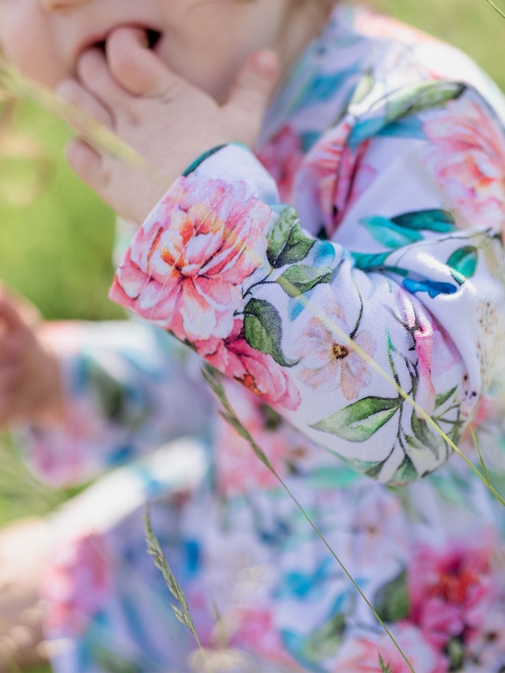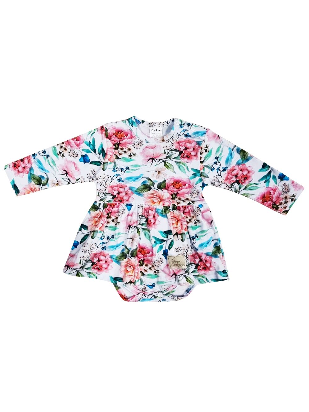 A body ruhákat a legkisebb hölgyeknek terveztük. Virágmintás pamutszövetből készítettük őket. A fehér alapon gyönyörűen kiemelkednek a bazsarózsa virágok és a zöld levelek. Gyengédnek és romantikusnak tűnnek. A szabás nagyon praktikus és kényelmes. Minőségi szegélyük van, amely nem nyomja és nem karcolja a gyerekeket. A szoknya a derékrészen varrott, alatta a body alsó része található. A patentos rögzítésnek köszönhetően könnyű a pelenkázás.