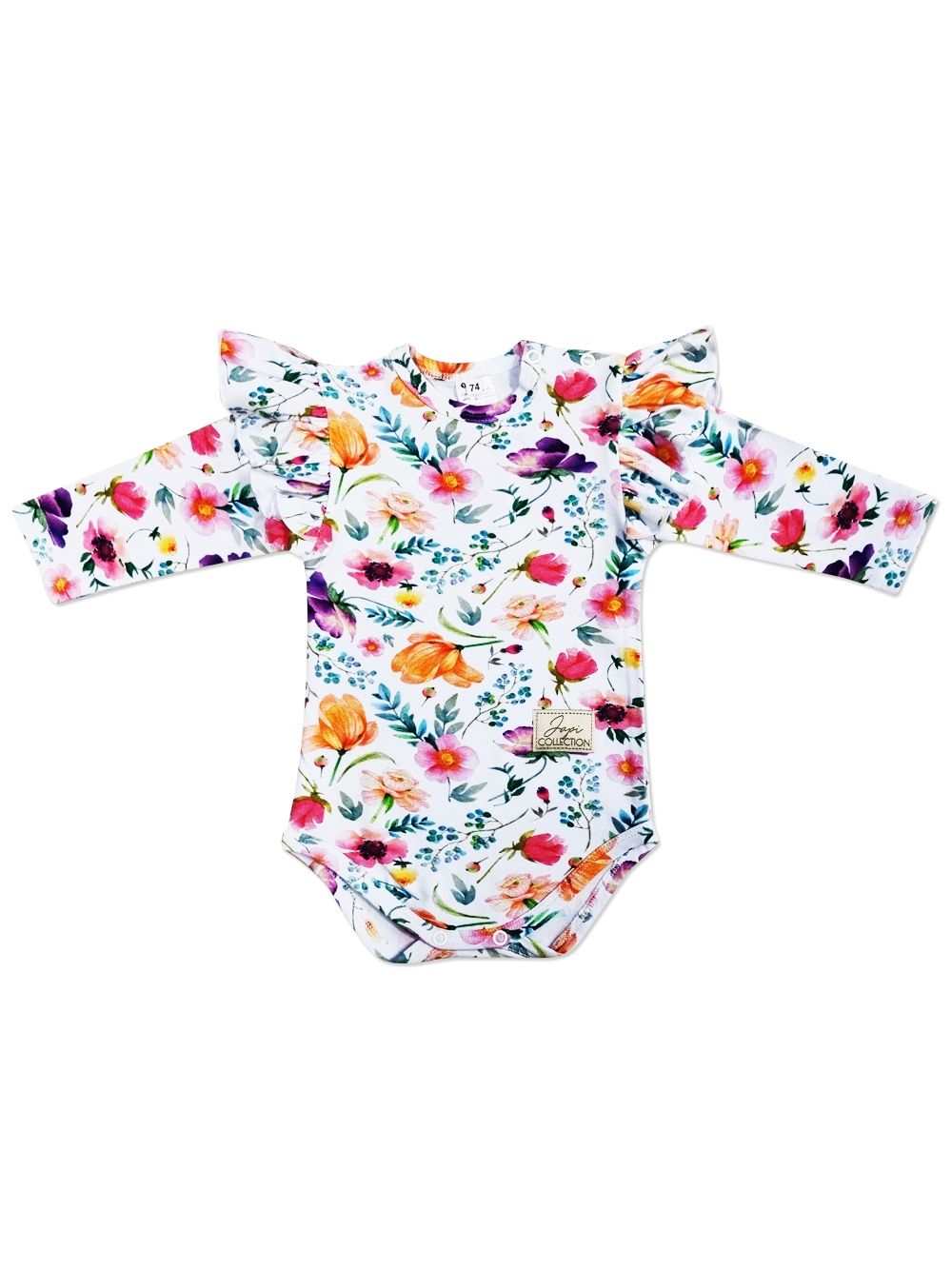 Imádni fogja ezeket a bodykat a kislányán. Gyönyörűek és nagyon kényelmesek. A hosszú ujjú bodyk vállán díszes fodor található. A baba bodyk a nyaknál egy patenttal záródnak, ami megkönnyíti a felvételt, és megakadályozza, hogy lecsússzon a baba válláról. A bodyk kiváló minőségű szegéllyel rendelkeznek, amely nem nyomja vagy karcolja a babát. A kellemes pamutszövet tanúsítvánnyal rendelkezik, így a bodyk születéstől kezdve alkalmasak a babák számára. A lábak közötti rögzítés patentokkal történik, ami megkönnyíti a pelenkázást.