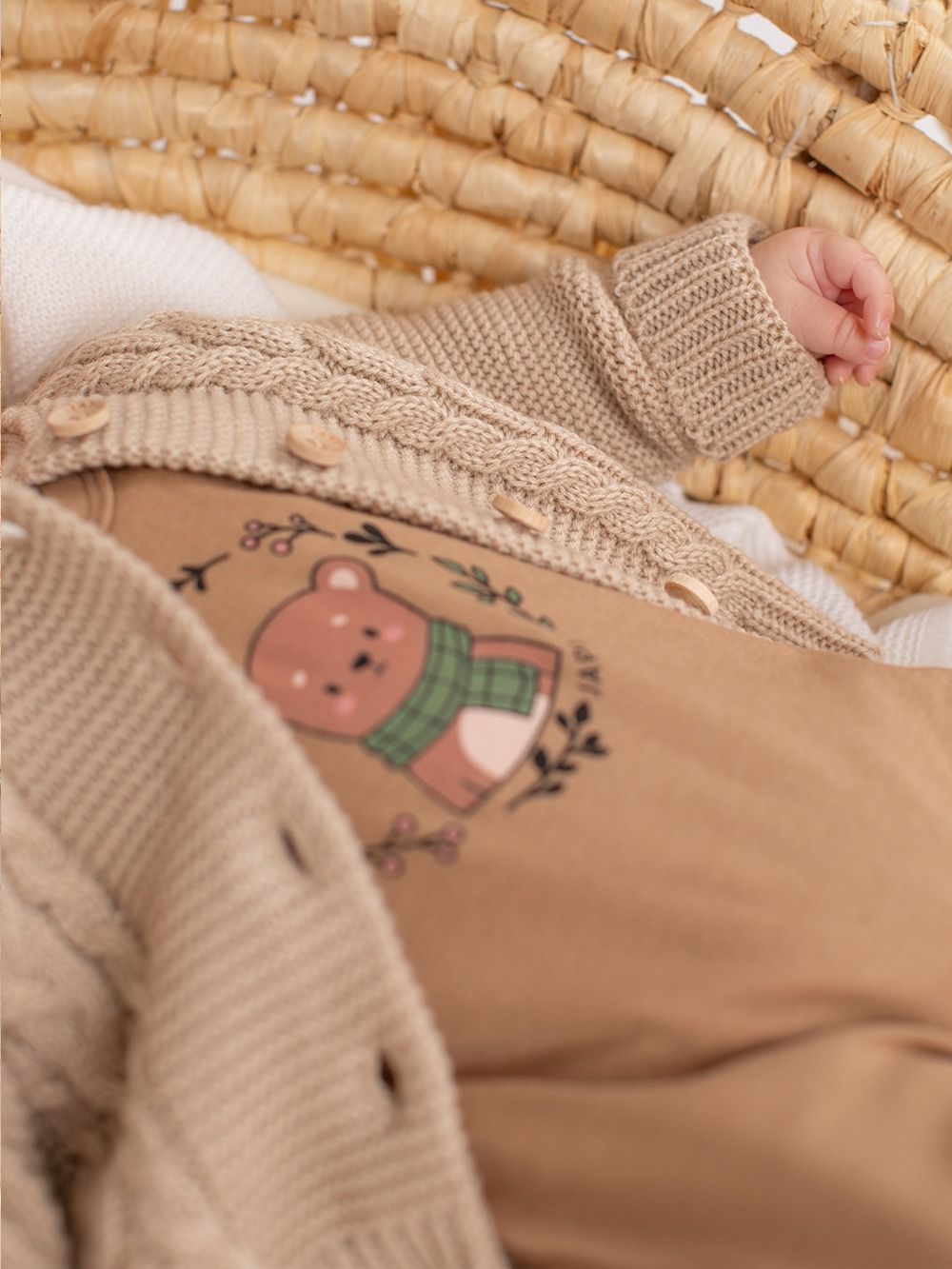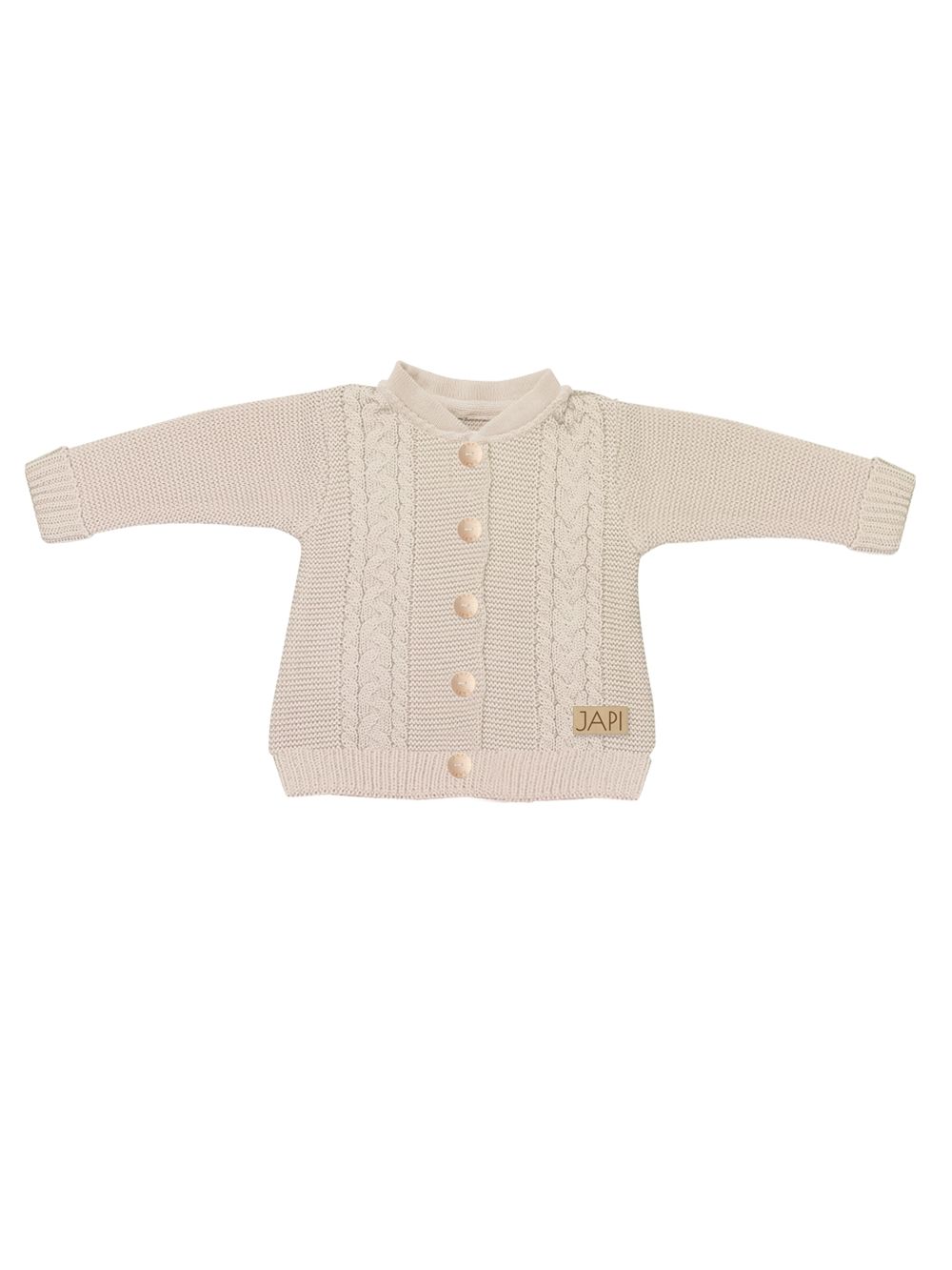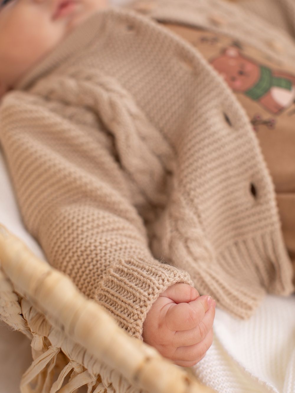 Az elegáns kötött WORM baba pulóver remek kiegészítő a hűvösebb napokra. Puha, kiváló minőségű fonalból készült, amely meleget és kényelmet nyújt a hidegebb napokon. A mintás dizájn és a finom kukacminta stílusossá teszi, míg a gombos záródás megkönnyíti az öltöztetést.
