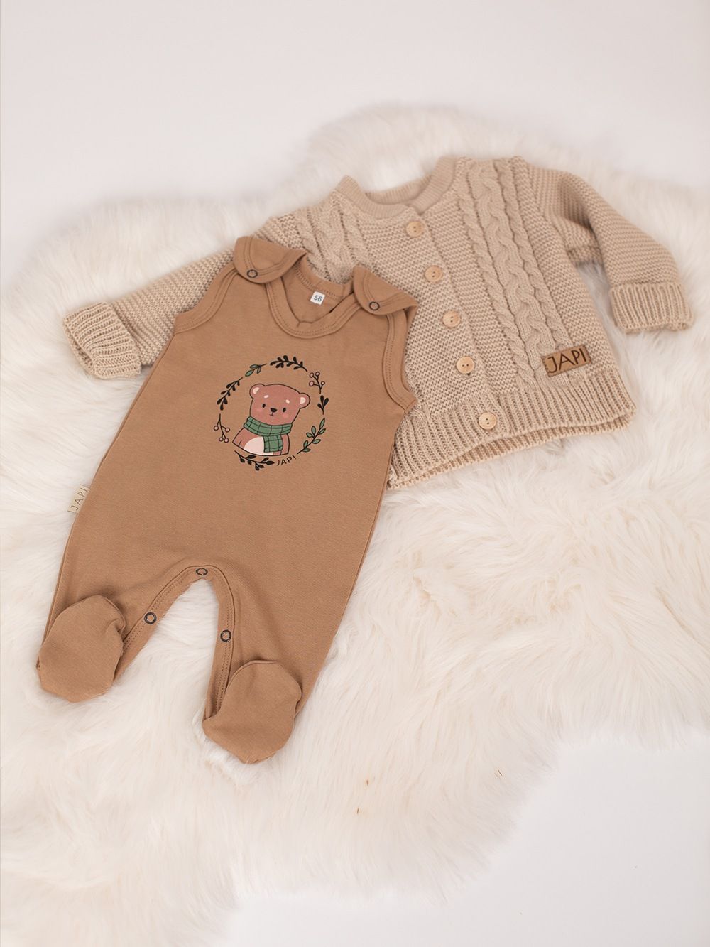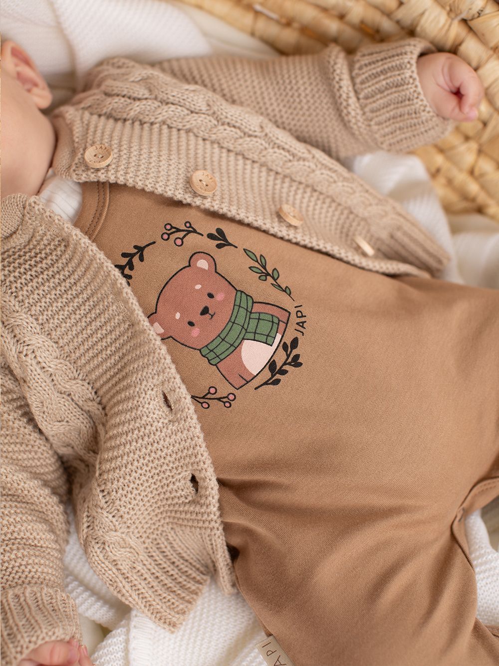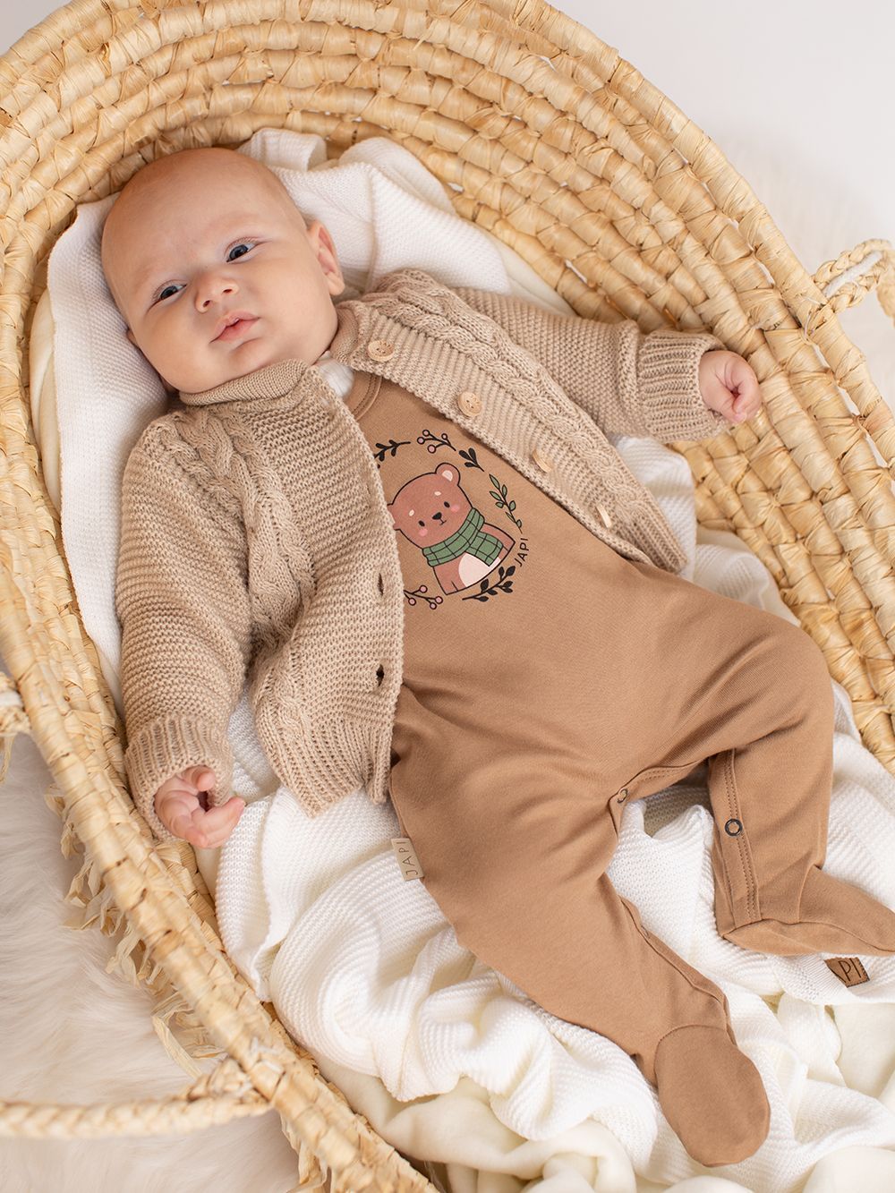 Az elegáns kötött WORM baba pulóver remek kiegészítő a hűvösebb napokra. Puha, kiváló minőségű fonalból készült, amely meleget és kényelmet nyújt a hidegebb napokon. A mintás dizájn és a finom kukacminta stílusossá teszi, míg a gombos záródás megkönnyíti az öltöztetést.