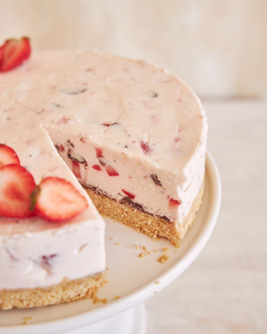 - A lehűtött tejszínt verjük fel a habfixálóval és a vaníliakivonattal. A görög joghurtot könnyedén forgassuk bele a tejszínhabba, végül forgassuk bele a kihűlt eperszószt és a felszeletelt epret is.