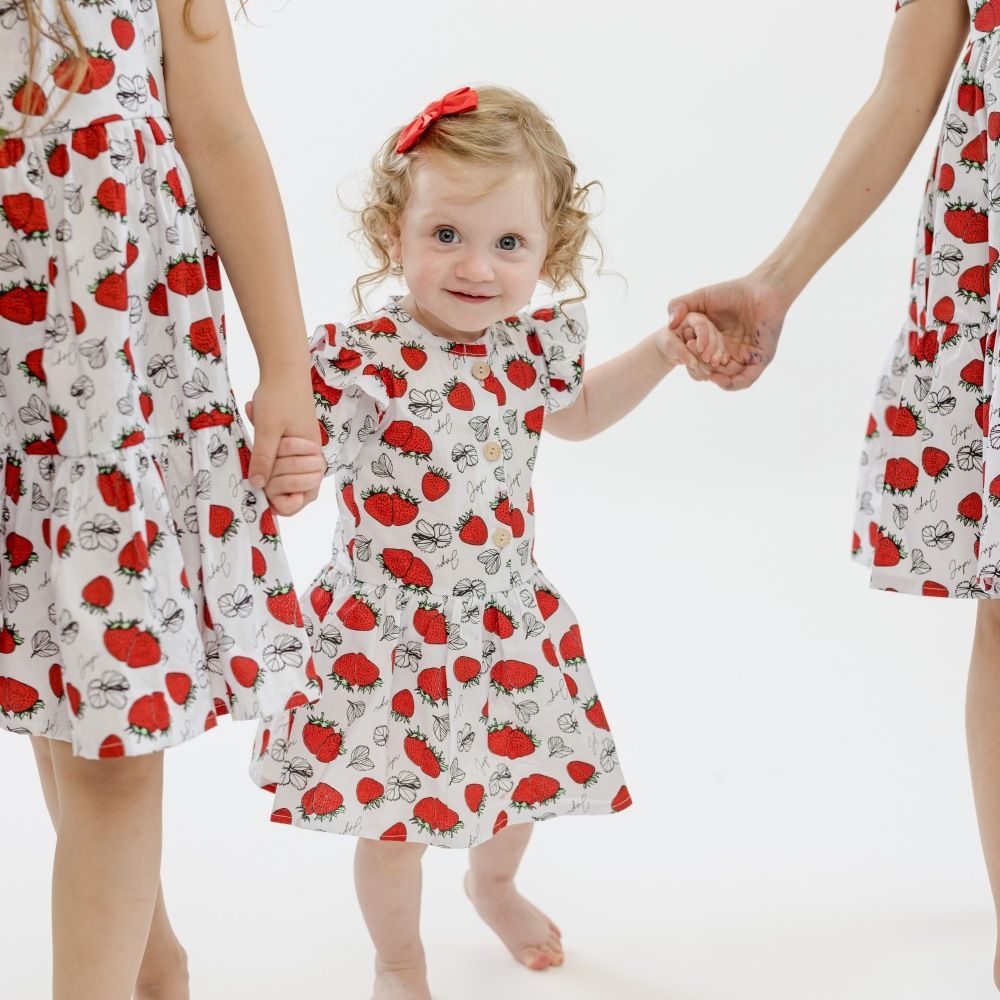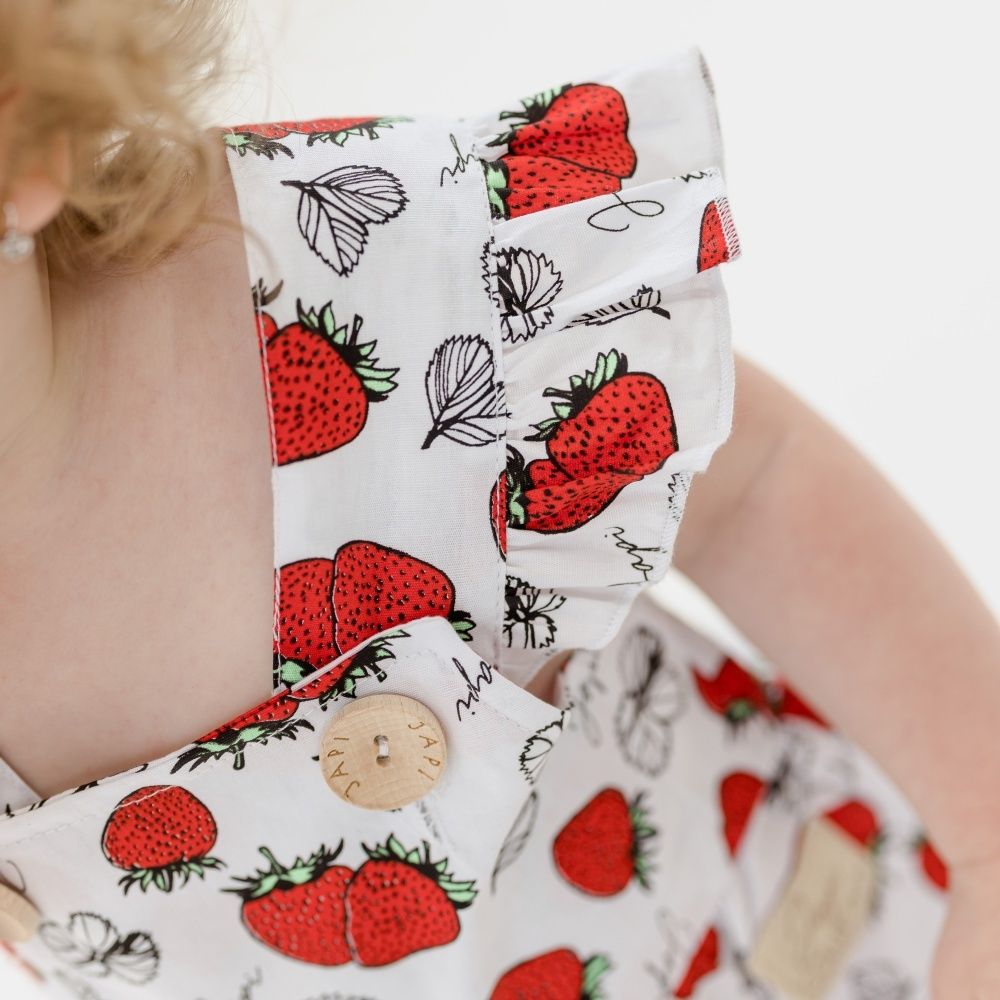 Egy epres kollekció, amely megragadja a nyár ízét... A fehér és a piros kontrasztja, a gyönyörű szabások és a kellemes anyag - mindezt ebben a lédús kollekcióban egyesítettük. Nemcsak az all-over mintás, 100%-os tanúsított pamut puplin (pamutvászon), hanem az új szabású, "puffos" ujjú fodros lányruhák és a népszerű babadarabok is elvarázsolják Önt. Öltöztesse kis eperkéit ebbe az ízletes kollekcióba, és élvezzék a nyári pillanatokat együtt a legteljesebben.