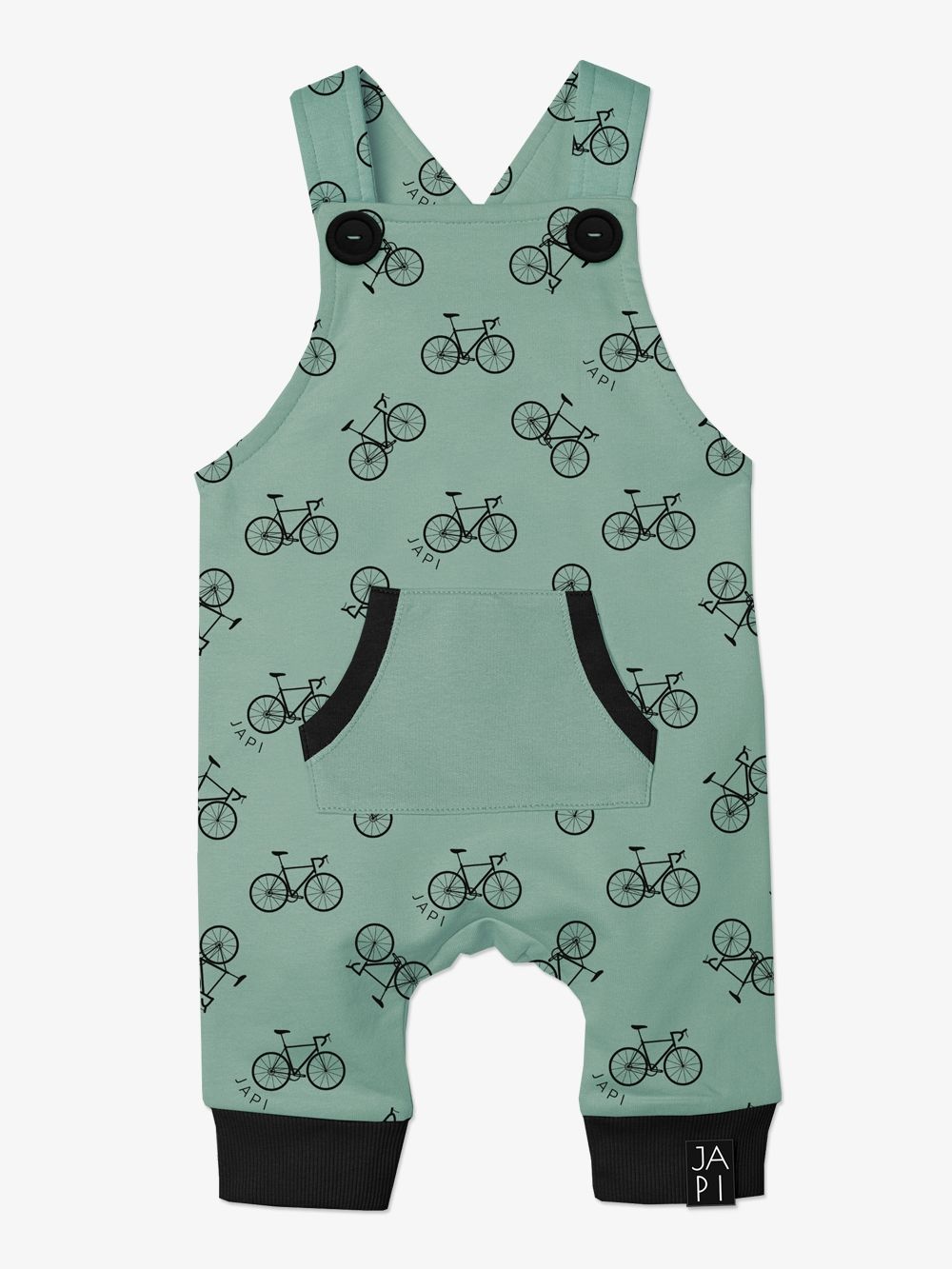 Zöld melegítő nadrág kicsiknek. Pamut anyagból készült, végig kerékpár mintával. A kontrasztos fekete szín modern és stílusos. A melegítőnadrágok lábszára alján elasztikus gumi található. Elülső kenguru zseb és gombos rögzítés a pántokon.