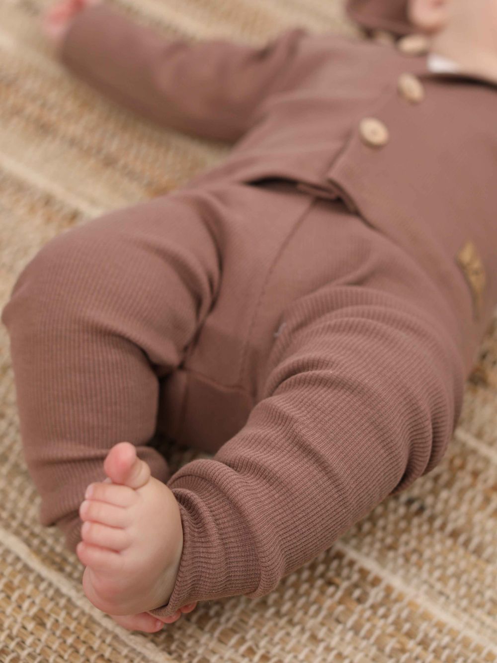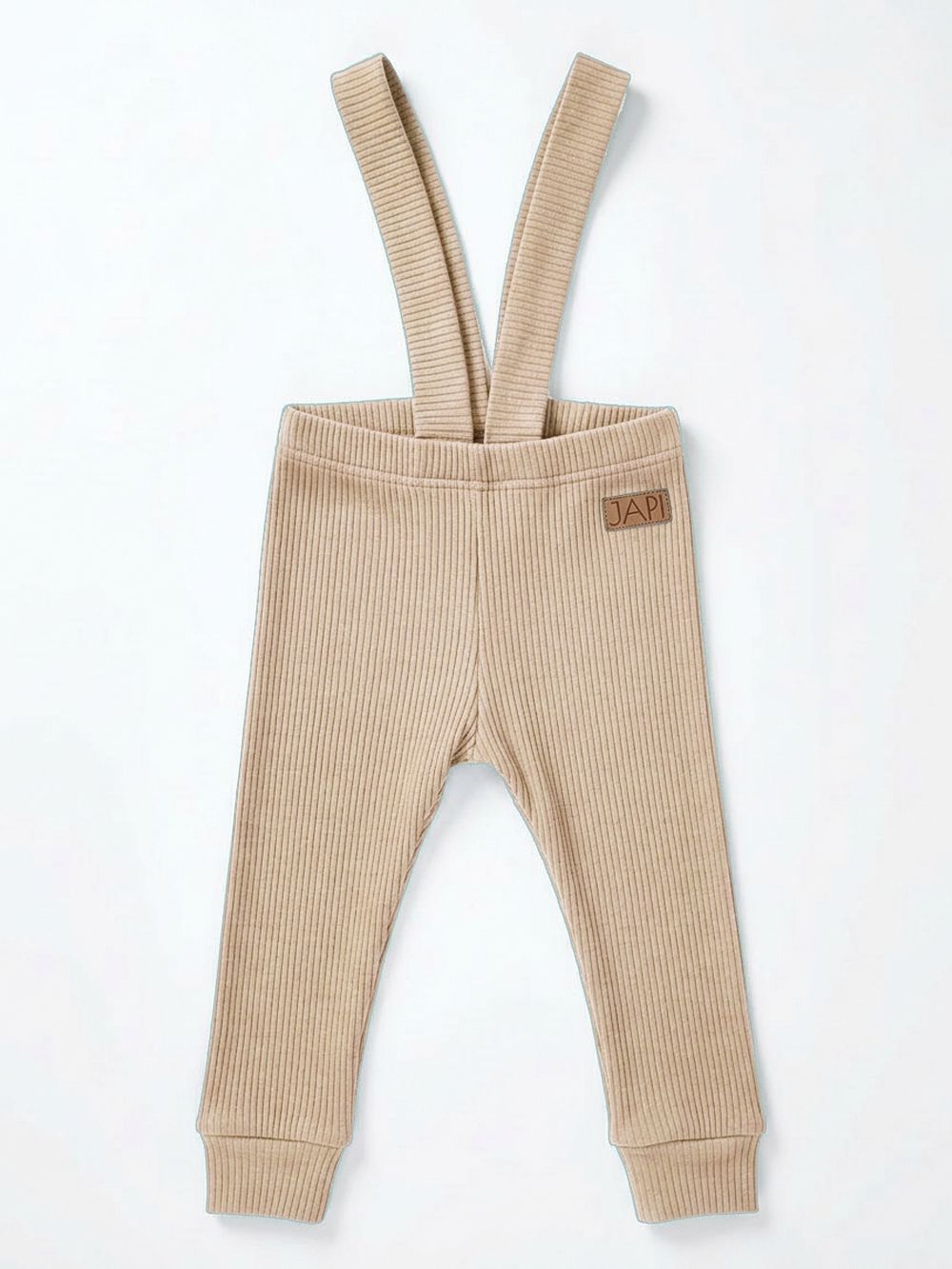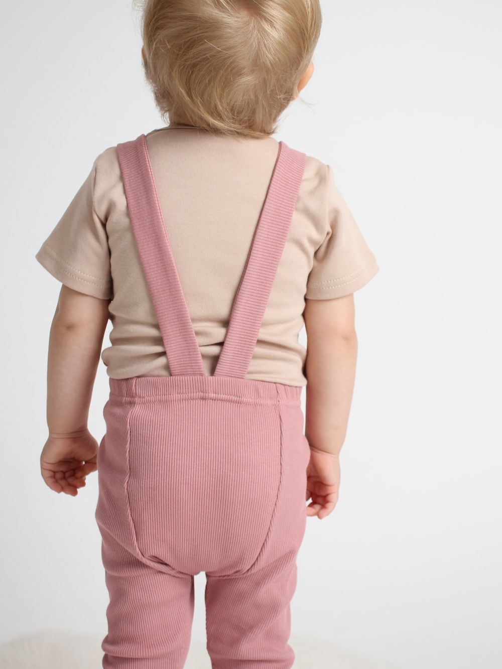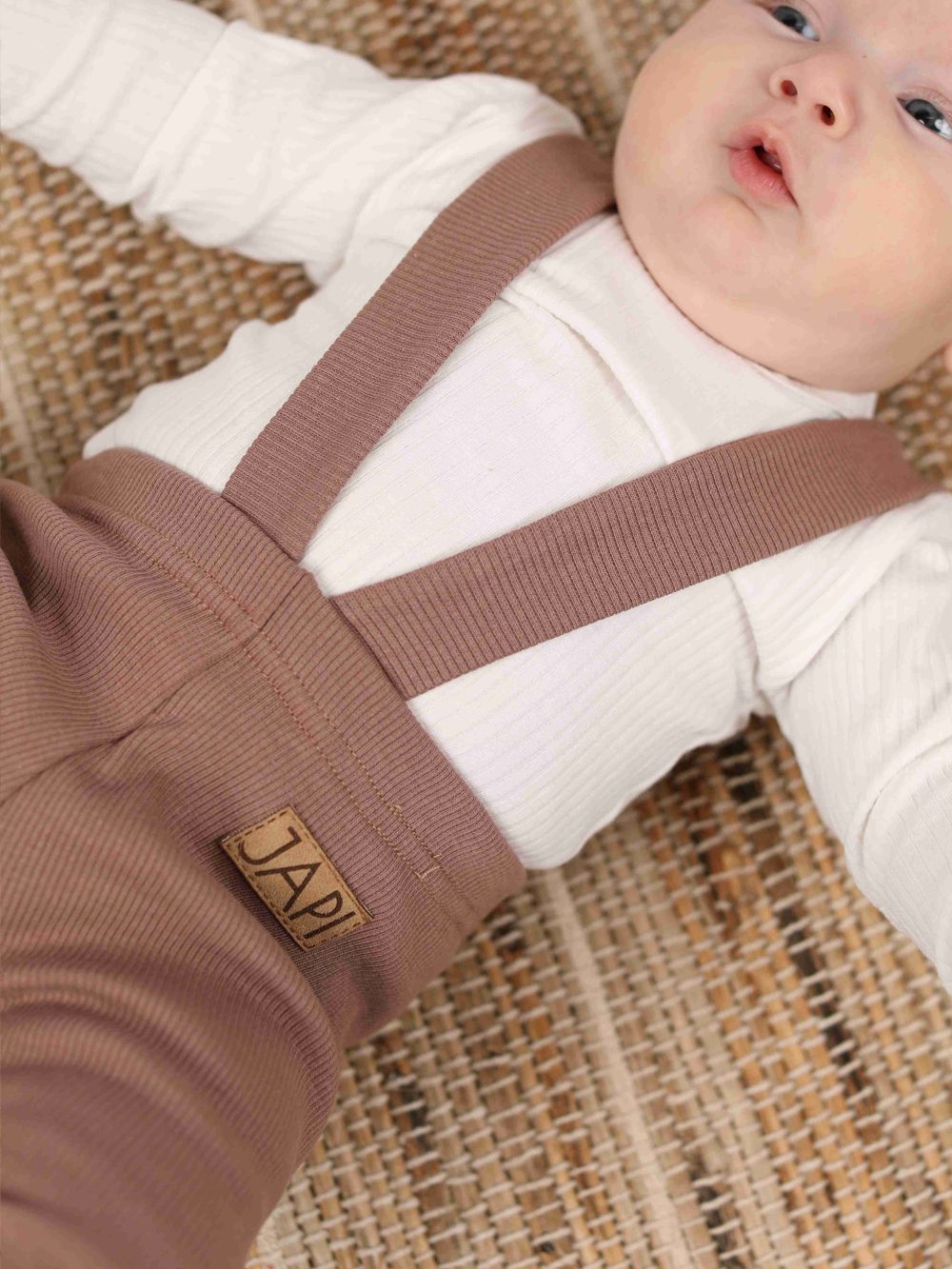 A kantáros melegítőnadrág 100% pamutszövetből készült, bordázott anyagból. Nagyon kényelmes viselet, és egy gyermekpólóval vagy bodyval együtt egy összeillő ruhaszettet alkothat.
