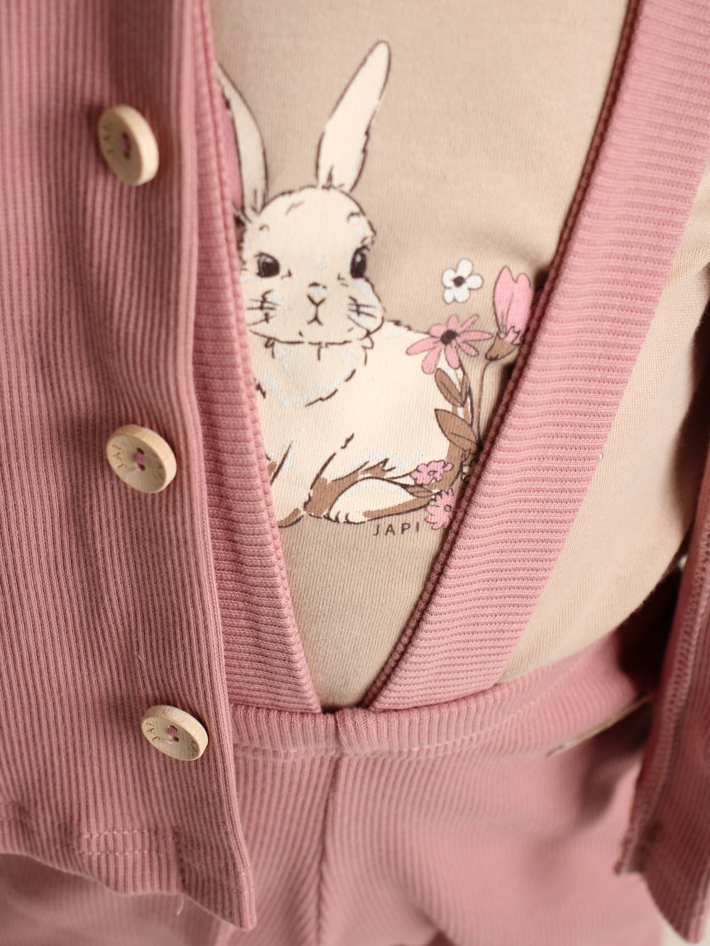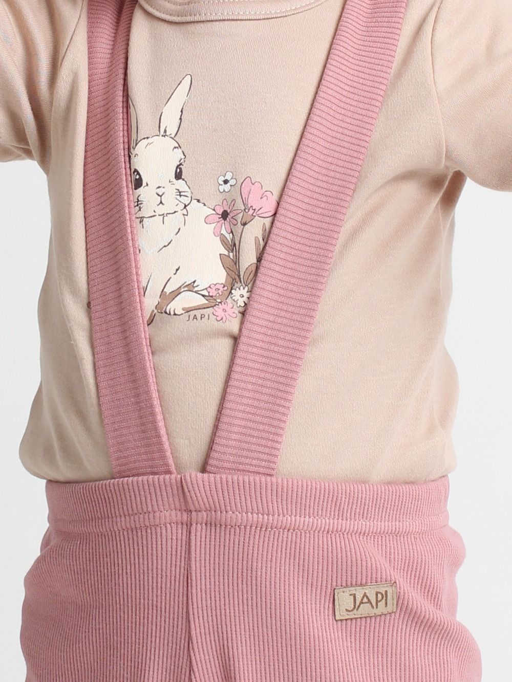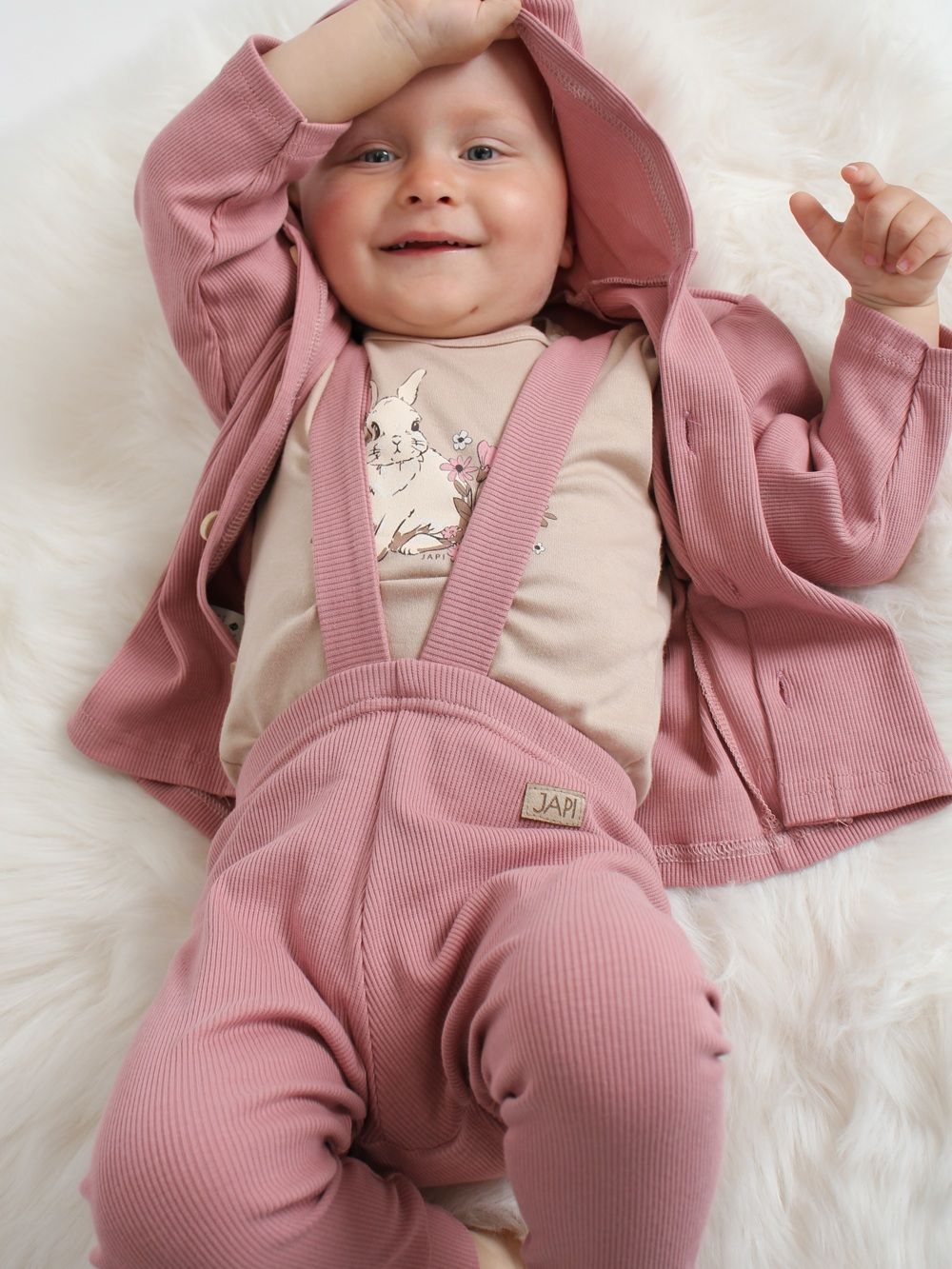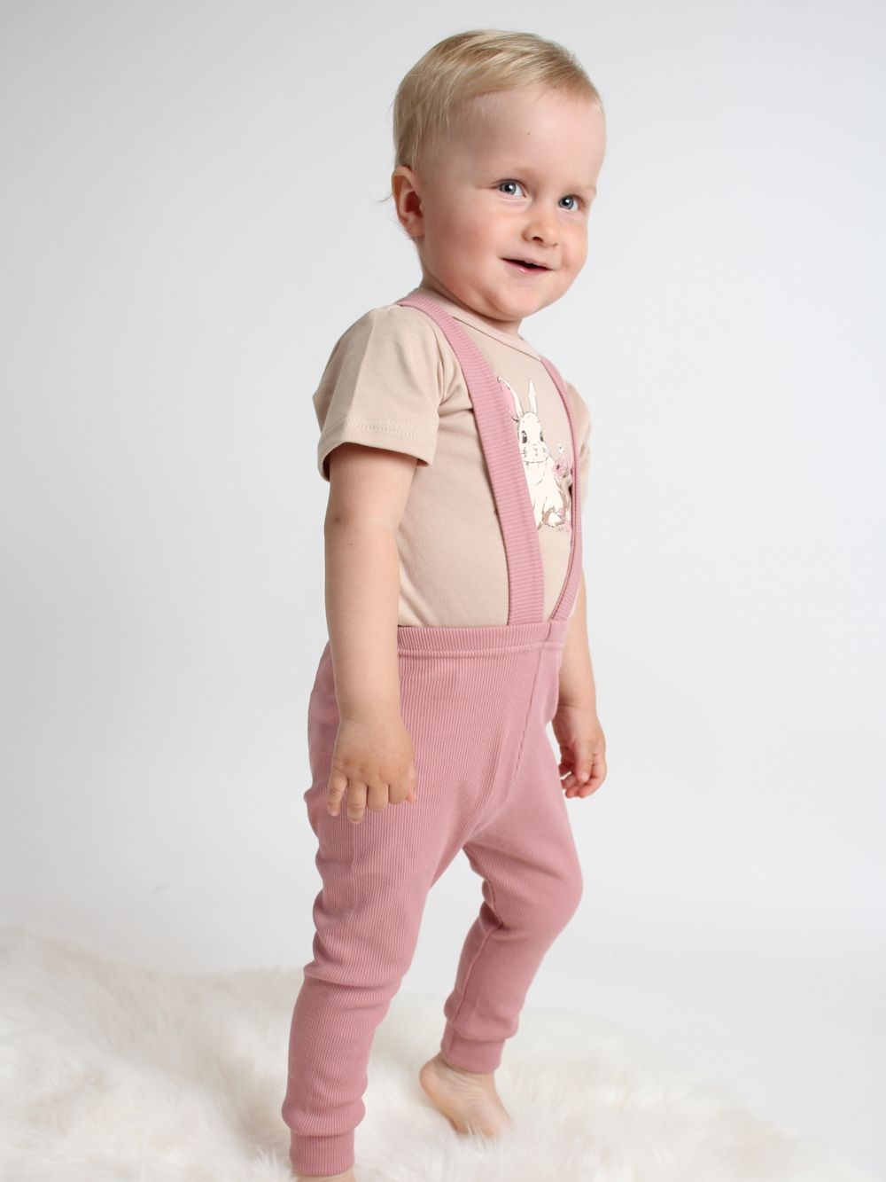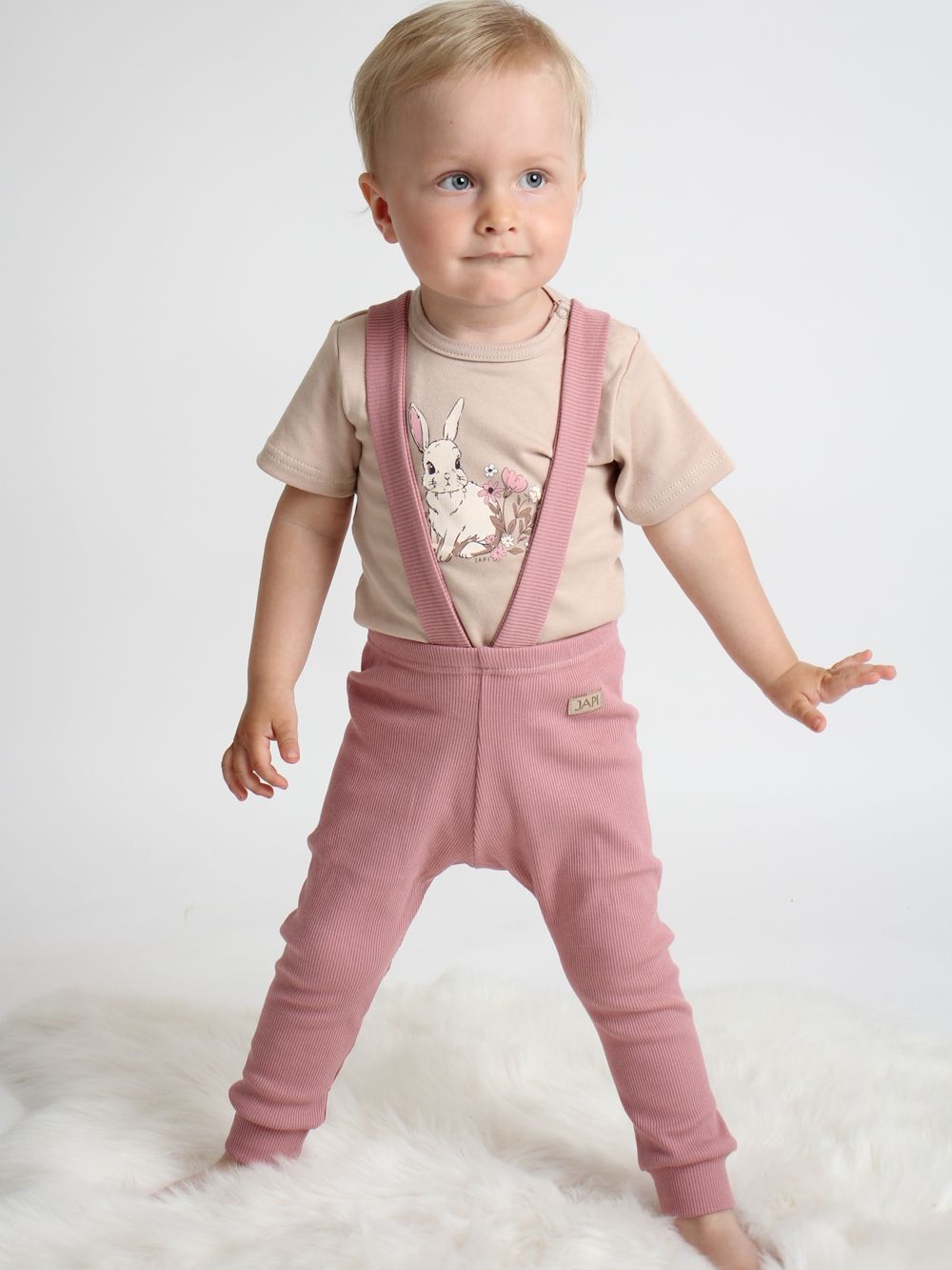 A kantáros melegítőnadrág 100% pamutszövetből készült, bordázott anyagból. Nagyon kényelmes viselet, és egy gyermekpólóval vagy bodyval együtt egy összeillő ruhaszettet alkothat.