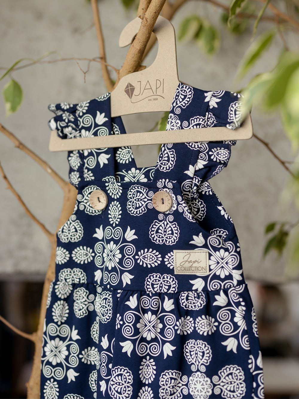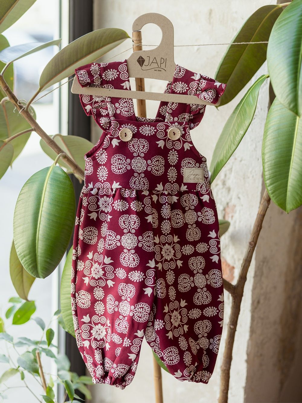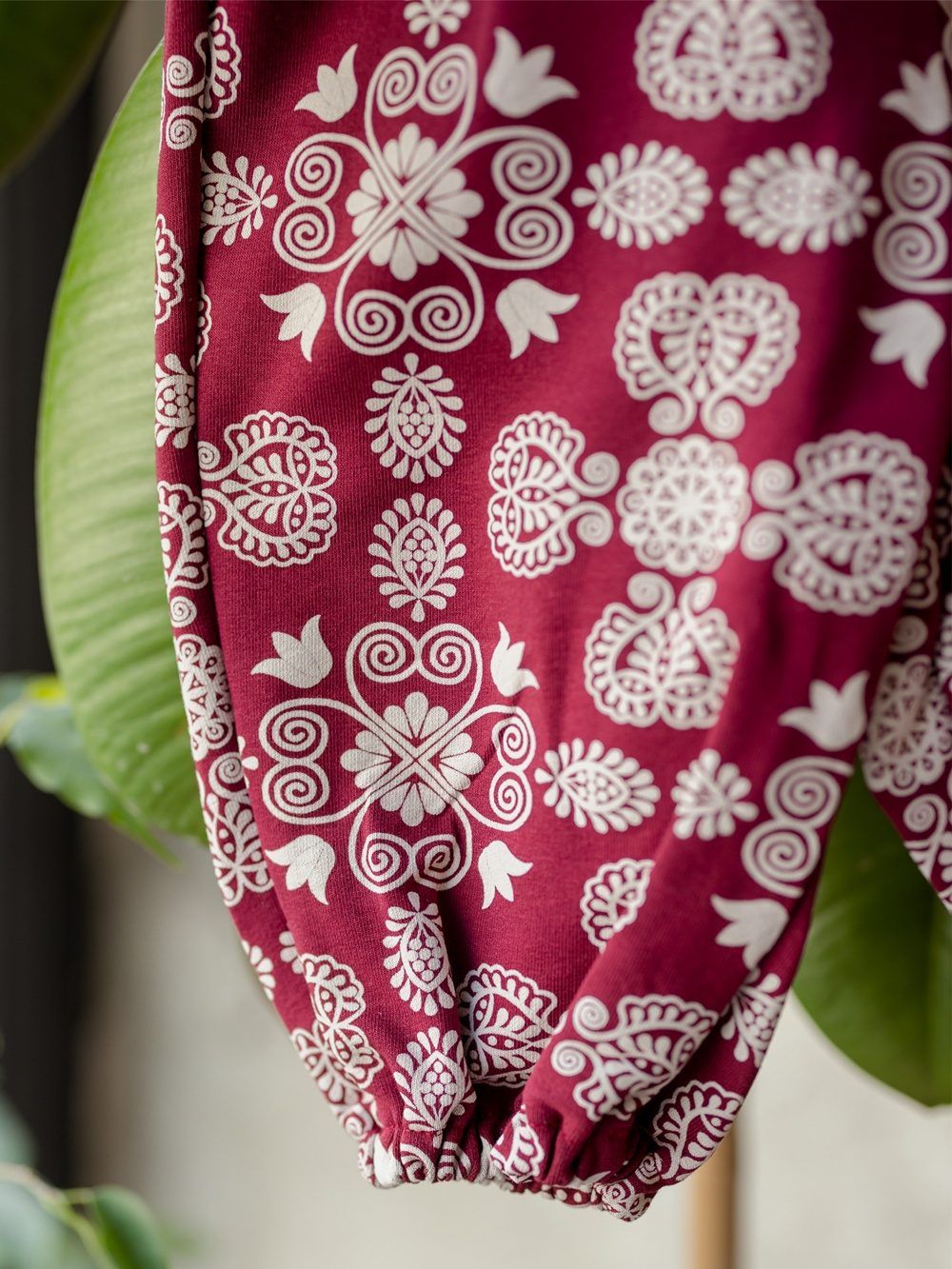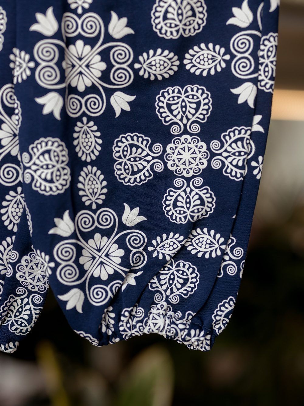 Kényelmes gyermek melegítőnadrág gyönyörű, népi hímzésen alapuló mintával. A sötétkék és bordó alapon kiemelkedik a fehér nyomtatás. A melegítőnadrág a kantárokon fagombokkal rögzíthető, a pántok fodrokkal vannak ellátva.