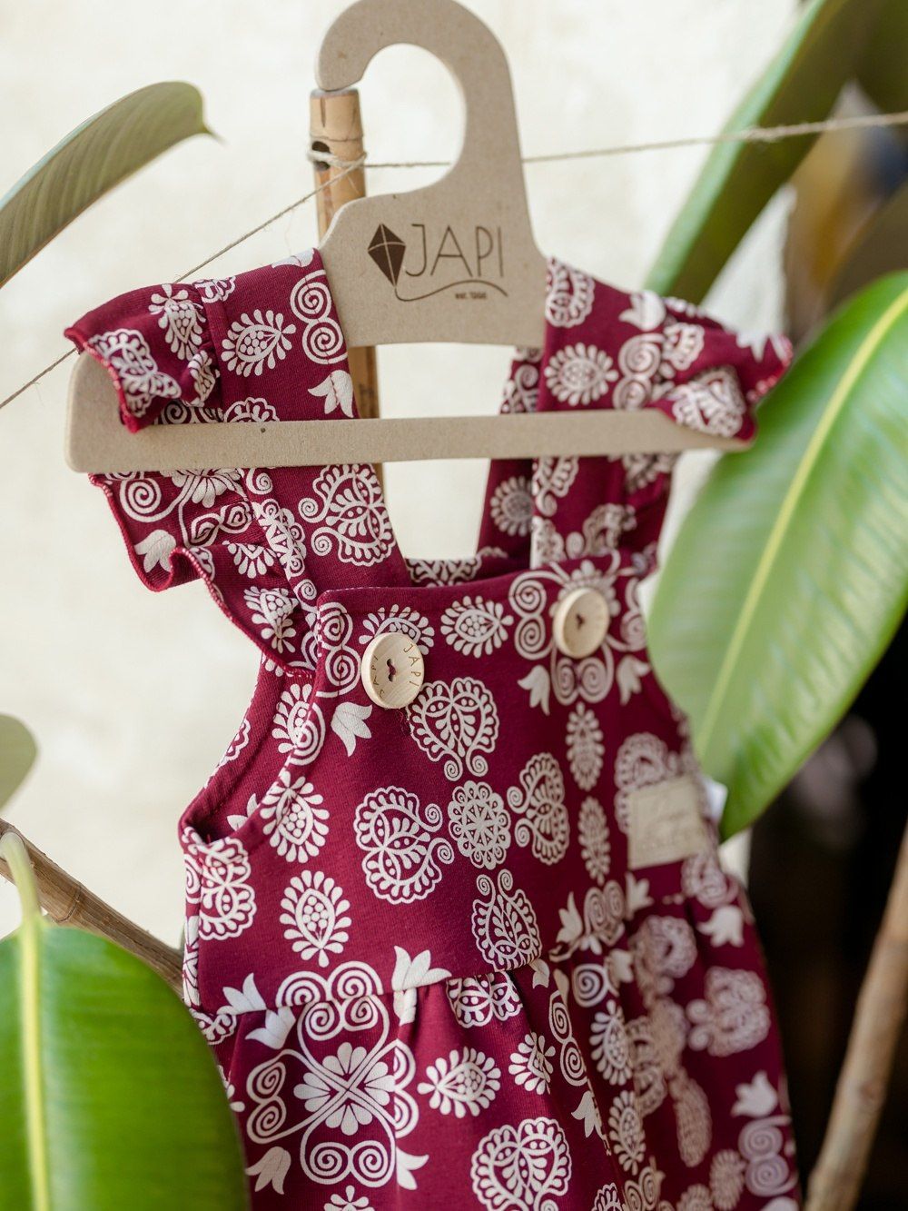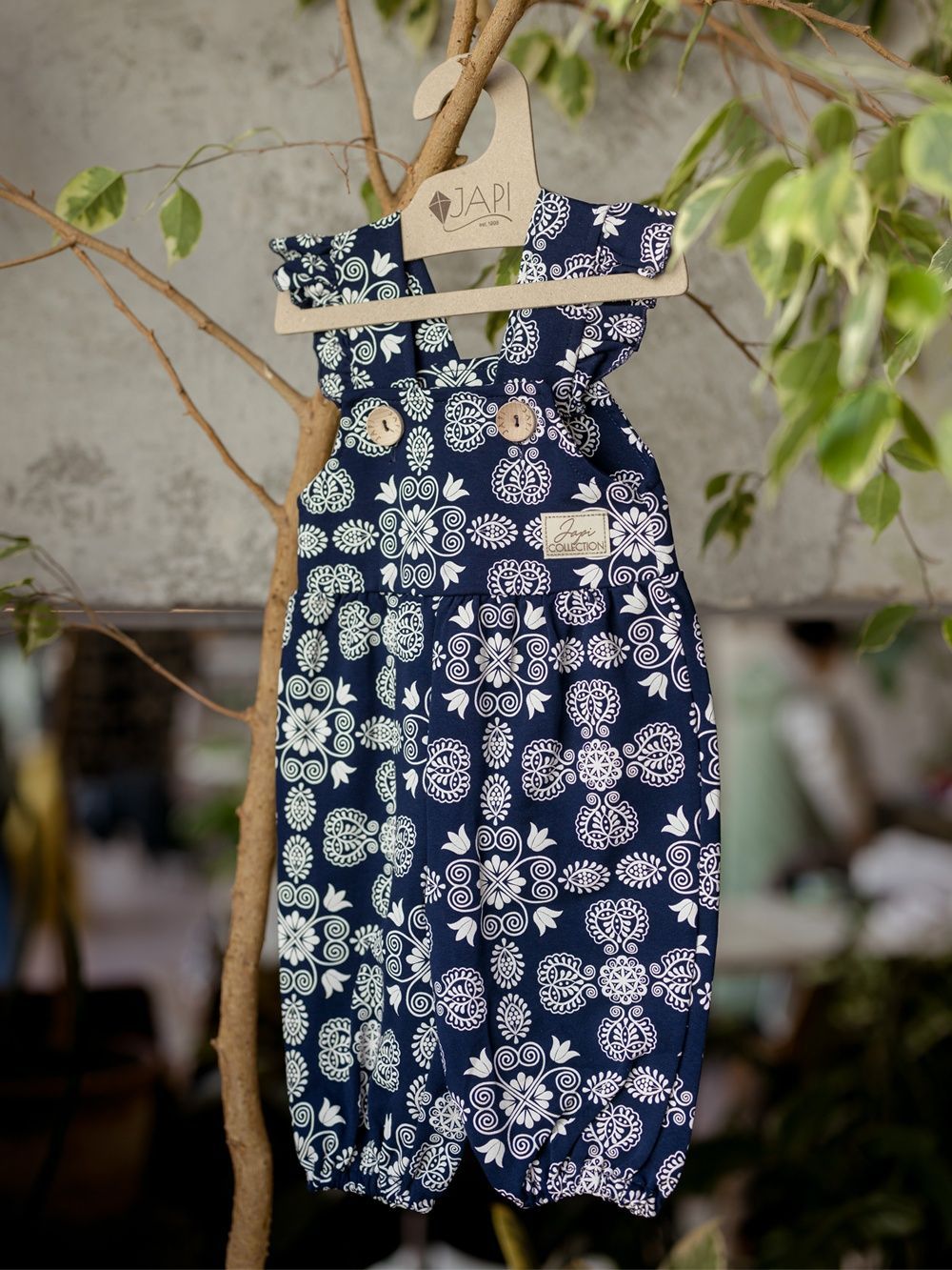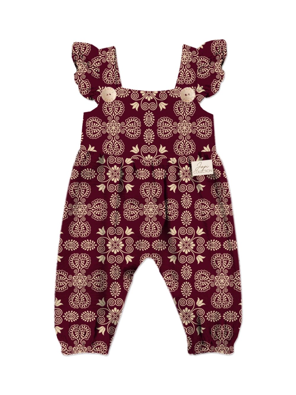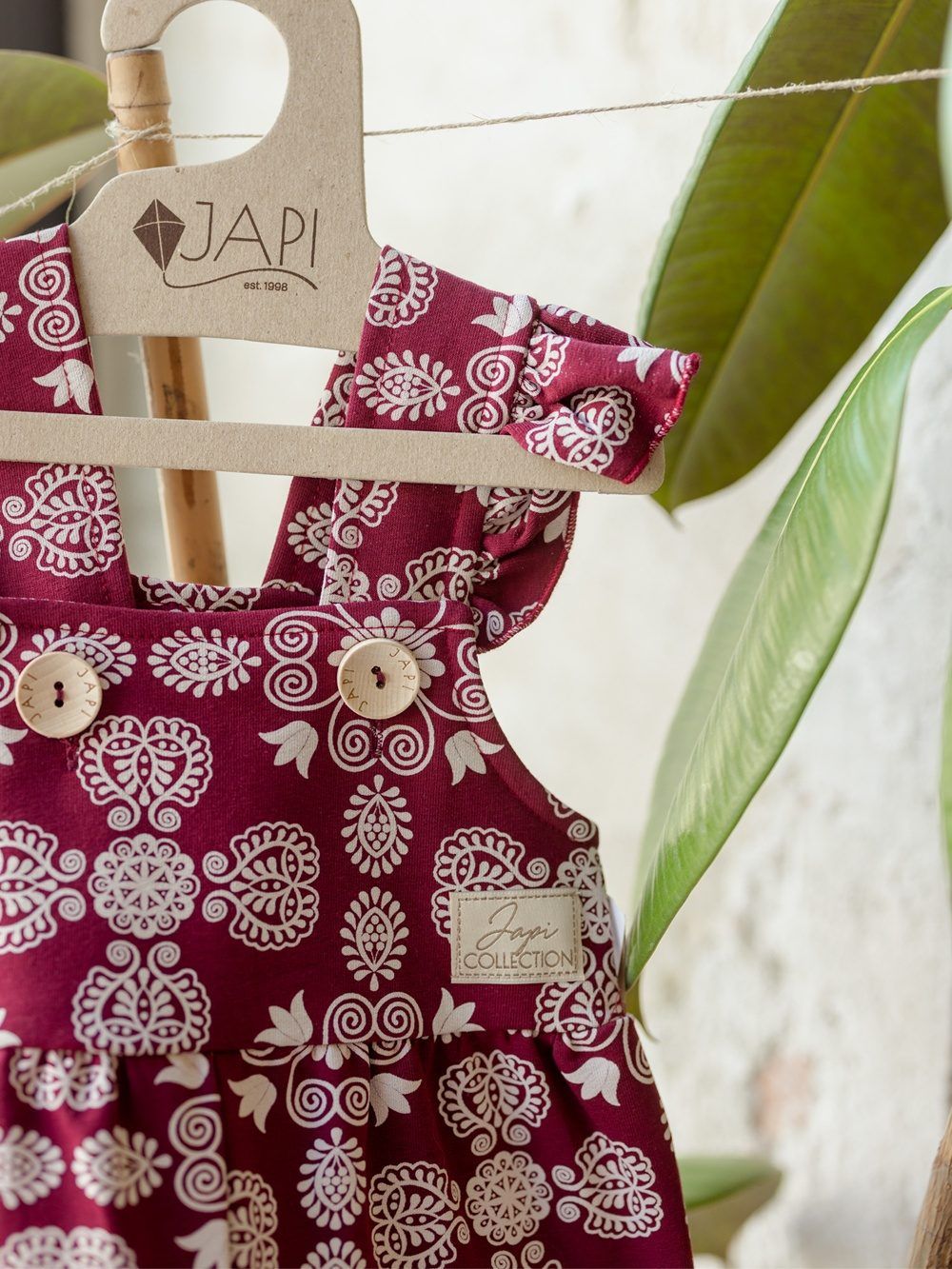 Kényelmes gyermek melegítőnadrág gyönyörű, népi hímzésen alapuló mintával. A sötétkék és bordó alapon kiemelkedik a fehér nyomtatás. A melegítőnadrág a kantárokon fagombokkal rögzíthető, a pántok fodrokkal vannak ellátva.