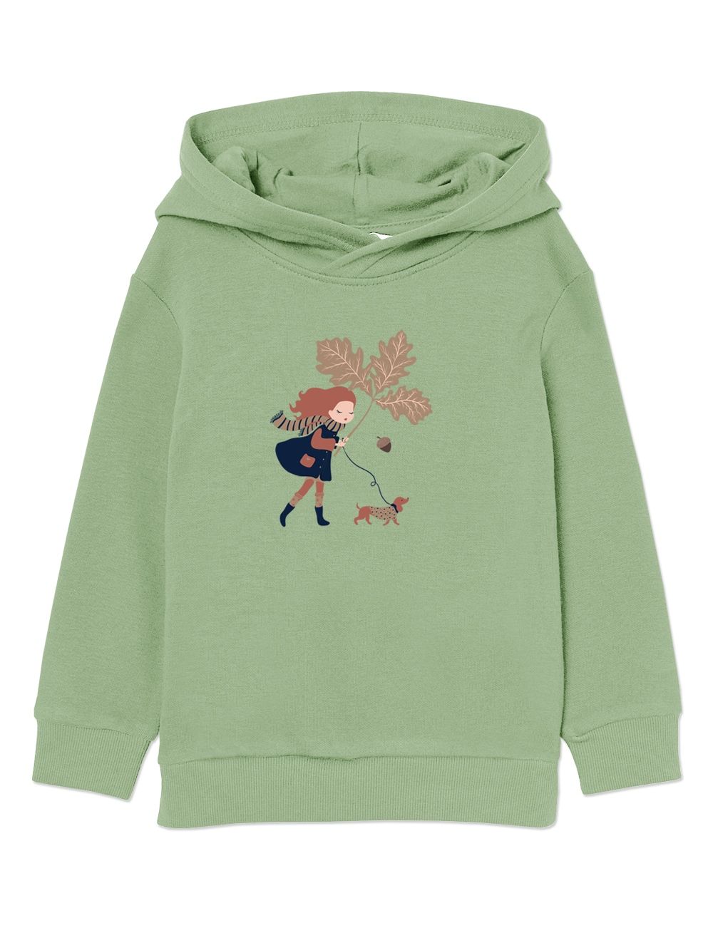 Ez a kapucnis lány pulóver tökéletes választás a hűvös őszi napokra, amelyek tele vannak kalanddal. Az elején egy kislány és kutyája sétál az őszi falevelek között – a grafika mesés és játékos hangulatot teremt. Puha anyagból készült, amely kellemes meleget és kényelmet biztosít egész nap. A kapucni praktikus, és véd a széltől. A hosszú ujjak és az alsó szegély rugalmas passzéval vannak ellátva, így a pulóver jól illeszkedik. A barna, rózsaszín és zöld árnyalatok az ősz színeit tükrözik, és könnyen kombinálhatók nadrággal vagy melegítővel.