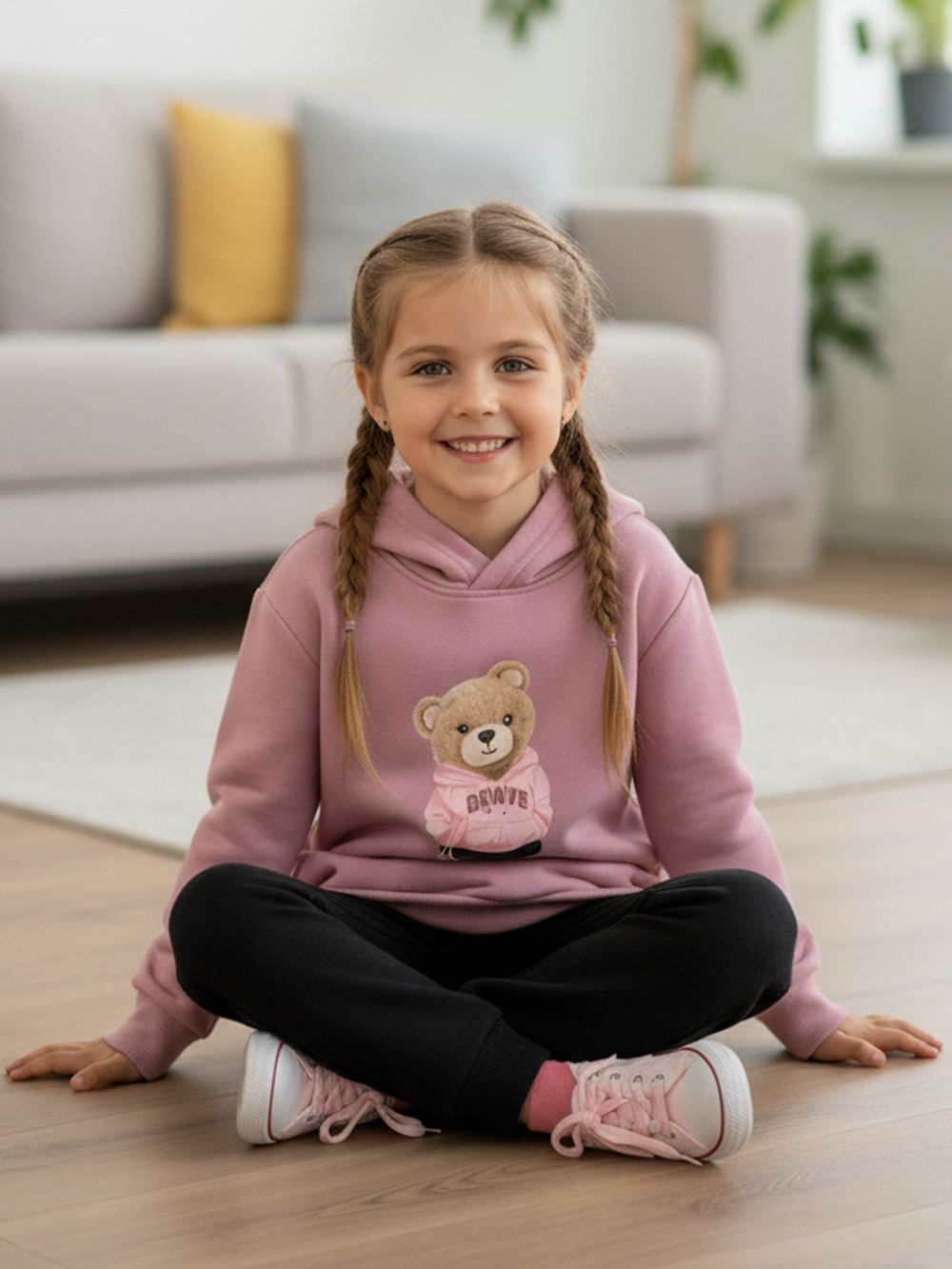 Ez a kapucnis lány pulóver tökéletesen ötvözi a játékos dizájnt és a praktikusságot. Az elején egy aranyos mackó látható feliratos pulcsiban, amely minden kis divatrajongó szívét meghódítja. A pulóver puha, kellemes anyagból készült, ami egész napos kényelmet biztosít. A kapucni védelmet nyújt a hideg ellen, és sportos megjelenést kölcsönöz az öltözetnek. A hosszú ujjak passzés kialakítása jobb illeszkedést biztosít. A finom árnyalat könnyen kombinálható más ruhadarabokkal, így ideális iskolába, játszótérre vagy hétvégi kirándulásokhoz. Remek választás minden lánynak, aki szereti az egyesített kényelmet és stílust – két színváltozatban elérhető.