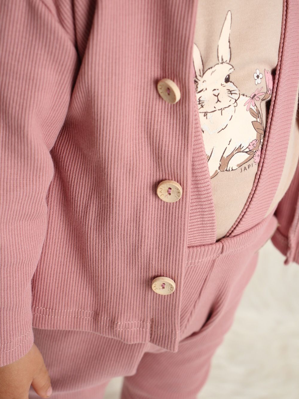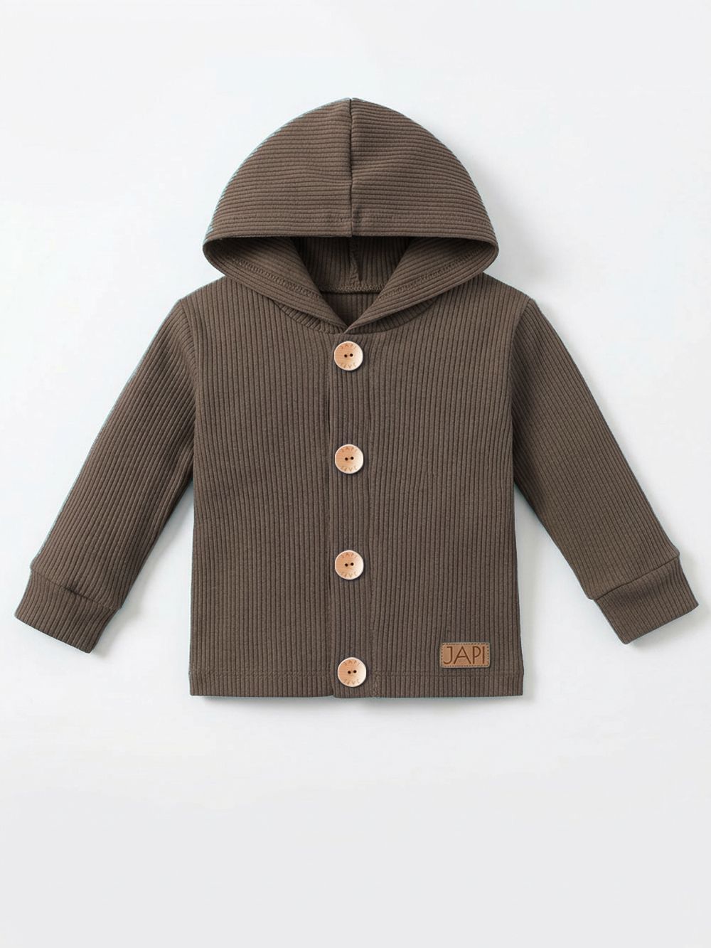 Gyerek kapucnis melegítő felső fa gombokkal.