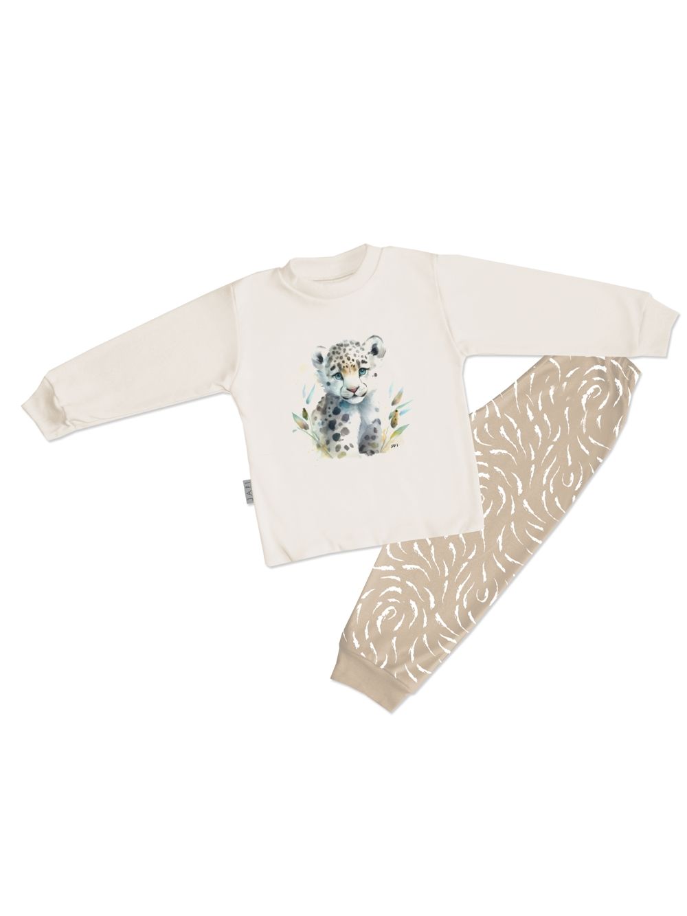 A LITTLE LEOPARD kollekció aranyos kislány pizsamája kényelmet és stílust visz minden gyerekszobába. A felsőrész akvarell hatású kis leopárd mintával díszített, amely gyengéd és játékos megjelenést kölcsönöz. A nadrágok leopárdmintára emlékeztető mintázata tökéletesen illik a felsőhöz, így a szett egyedi és bájos. A pizsama puha, légáteresztő pamutból készült, amely kíméletes az érzékeny gyermekbőrhöz. A rugalmas mandzsetták a kar- és lábszárvégeken biztosítják a kényelmes illeszkedést és a forma megtartását több mosás után is. Tökéletes nyugodt alváshoz és vidám reggelekhez.