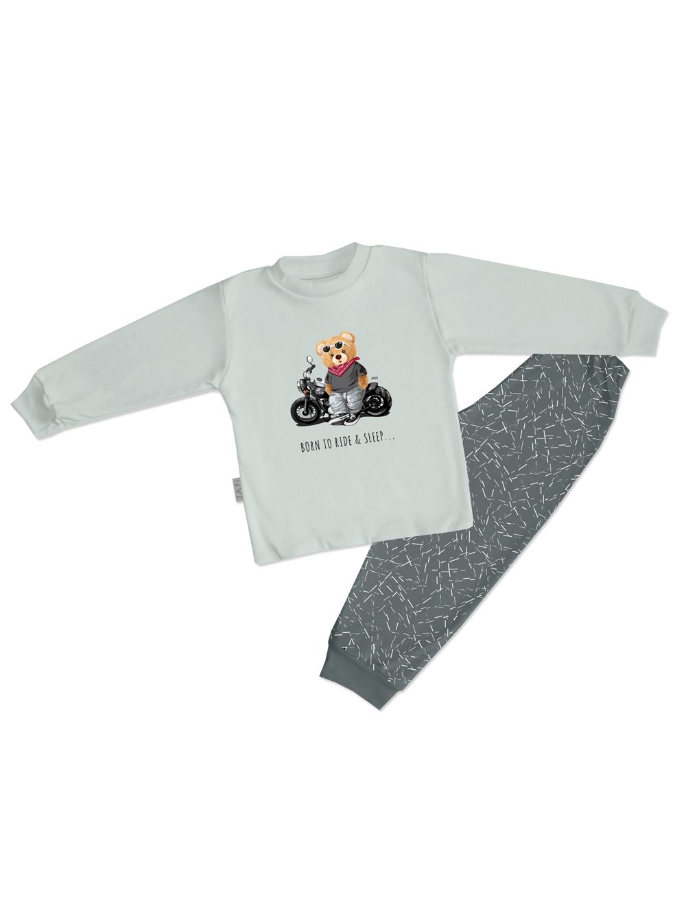 Eredeti fiú pizsama motoros macival RIDER. A felsőrész motoron ülő maci nyomatával és felirattal díszített, amely játékos és vagány hangulatot ad a szettnek. Puha pamutból készült, kellemes tapintású és kíméletes a gyermek bőréhez. A sötétszürke nadrág finom mintázattal és rugalmas derékpánttal kényelmes viselet egész éjszaka. A fiú pizsama hosszú ujjakkal és nadrággal rendelkezik, amelyek melegen tartanak hűvösebb estéken. A kényelmes szabás szabad mozgást biztosít és elősegíti a nyugodt alvást.