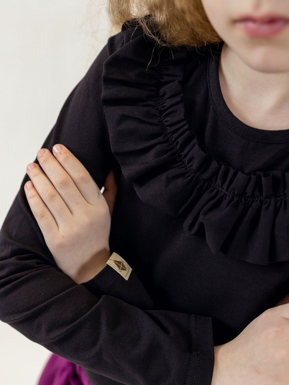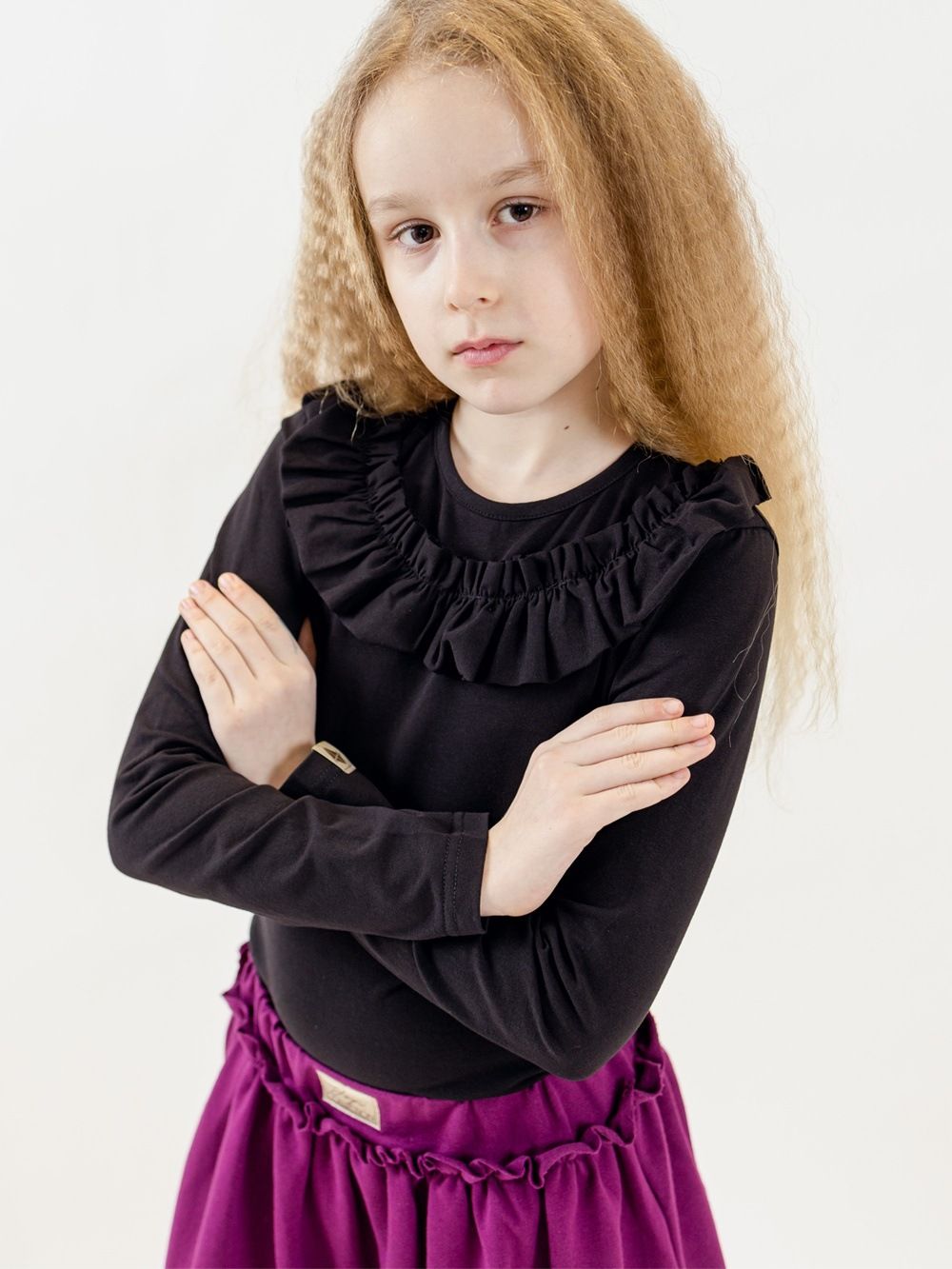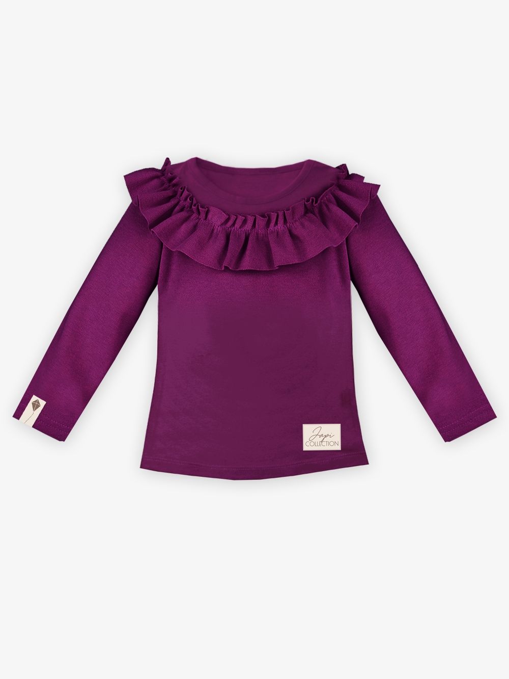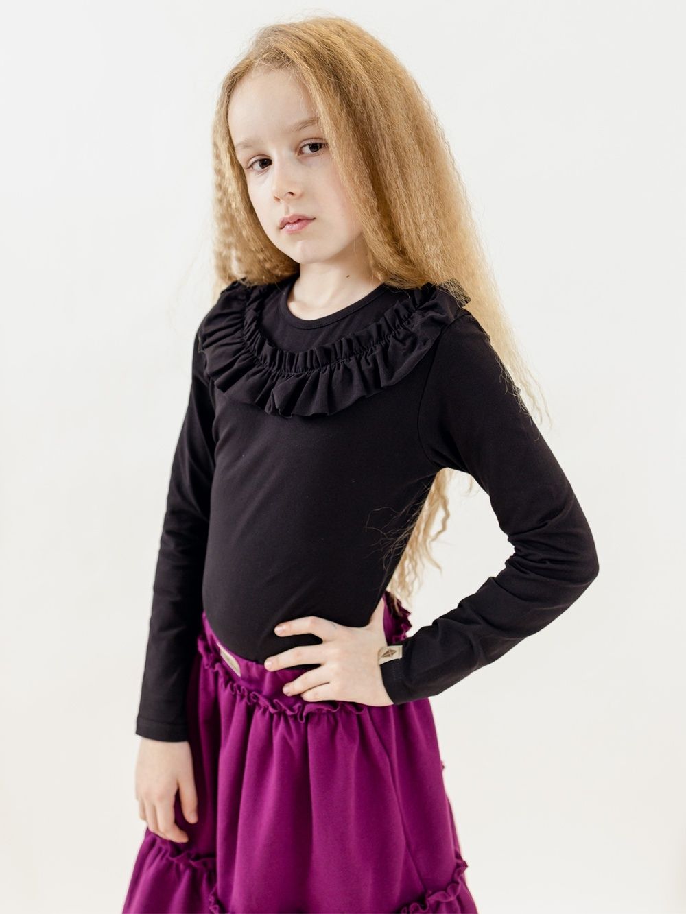 Ennek a szép pólónak a tetején díszes fodrokat helyeztünk el. A póló elegánsan néz ki, és alkalmas szoknyával vagy leggingsszel való kombinálásra. Használja családi összejövetelekhez vagy ünnepi alkalmakhoz. Fekete és lila színben található.
