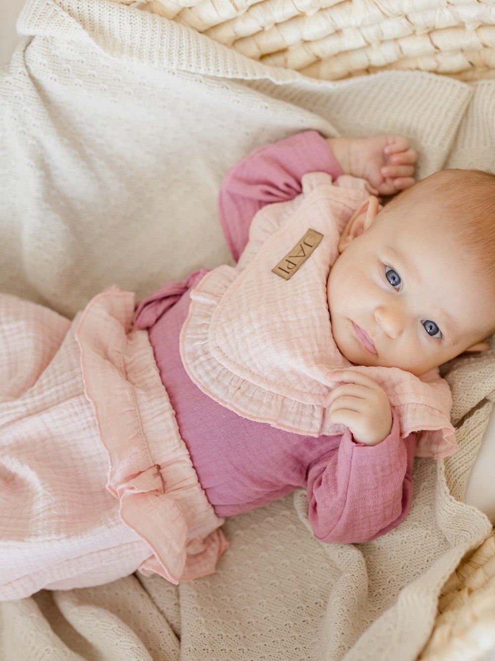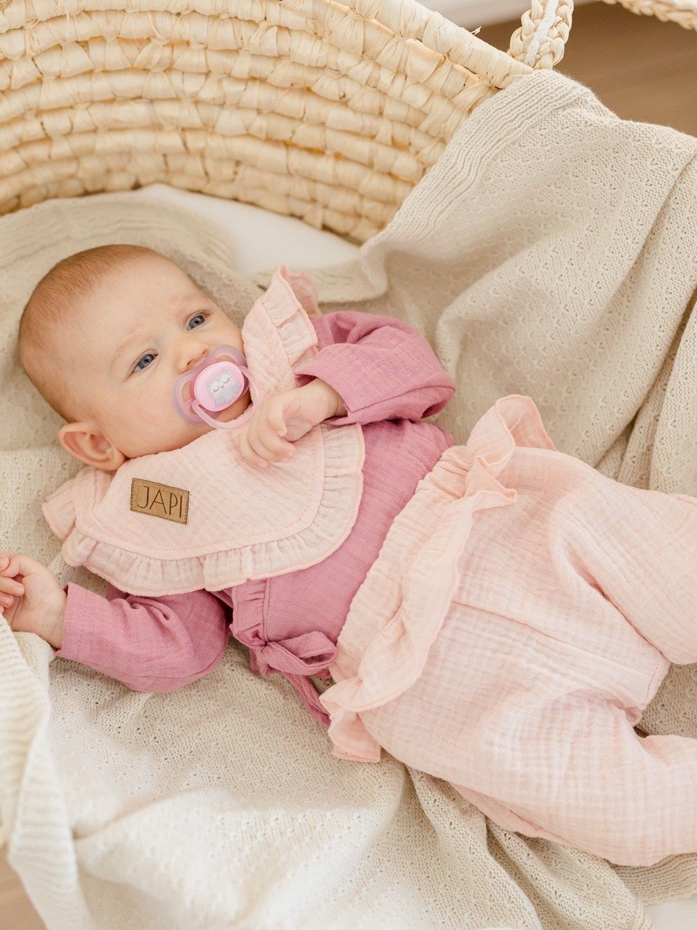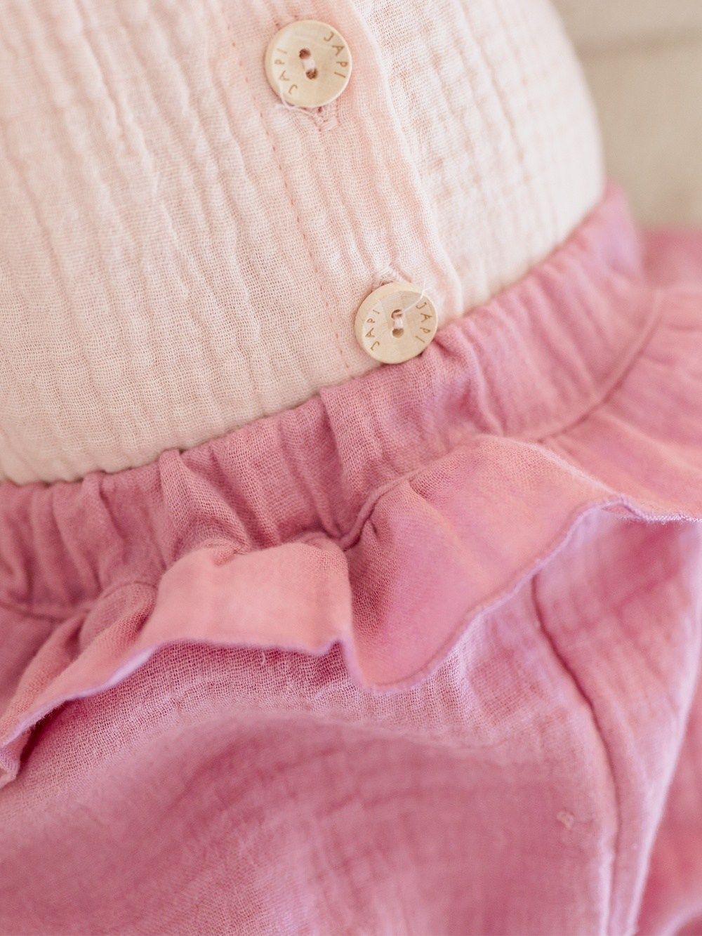A nadrág 100% pamut muszlinból készült rózsaszín és sötét rózsaszín színben. Dekoratív fodros a dereka. Szellős és alkalmas nyárra. Alkalmas gyermekek születésétől.