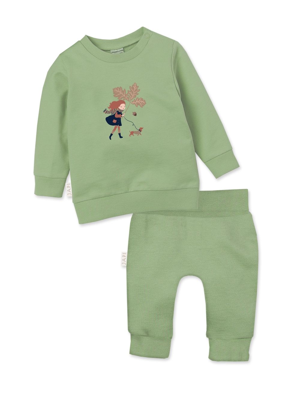 Ez a bájos gyerek szett – pulóverből és nadrágból áll – tökéletes választás a hűvösebb napokra. A pulóver elejét egy játékos illusztráció díszíti: egy kislány sétál kutyusával a lehulló őszi falevelek között, ami kellemes, őszi hangulatot áraszt. A puha és kényelmes anyag maximális kényelmet biztosít játékhoz és pihenéshez is. A rugalmas mandzsetták a ruhadarabok szárain és nyakrészen jól tartanak és könnyűvé teszik az öltöztetést. Három gyönyörű őszi színben kapható – barna, púderrózsaszín és világoszöld. Praktikus és stílusos szett hétköznapokra, sétákra vagy látogatásokhoz.