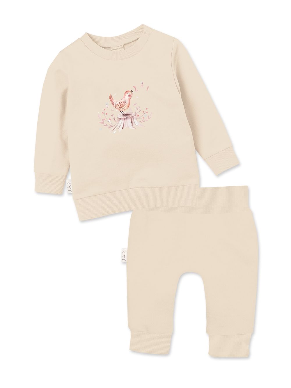 A MUSIC babaszett éneklő madár mintával praktikus és stílusos választás a mindennapokra. A szett egy kényelmes, hosszú ujjú pulóverből és egy puha nadrágból áll, amely rugalmas derékrésszel és bordás passzéval biztosítja a szabad mozgást és a kényelmet. A pulóvert egy vidám madárkás minta díszíti, amely játékos és aranyos megjelenést kölcsönöz. Puha, bőrbarát anyagból készült, így tökéletes otthoni viseletre és sétákra is.